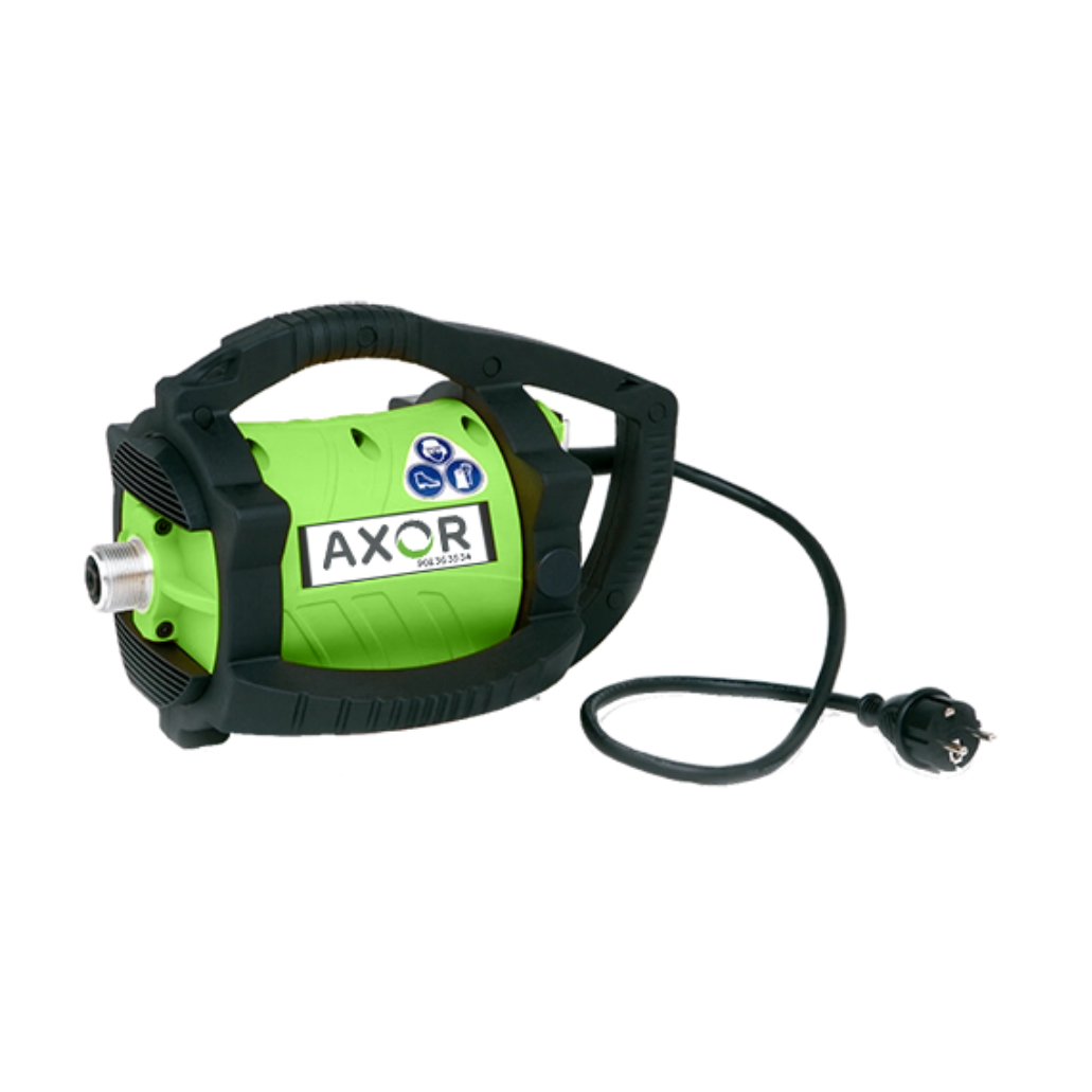 Vibrador portátil para hormigón. Motor sobredimensionado, con refuerzo de cable de conexión. Interruptor integrado en el asa y protegido. Carcasa de alta resistencia y con doble aislamiento contra salpicaduras y accesos al motor. Correa para llevar colgado.
