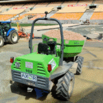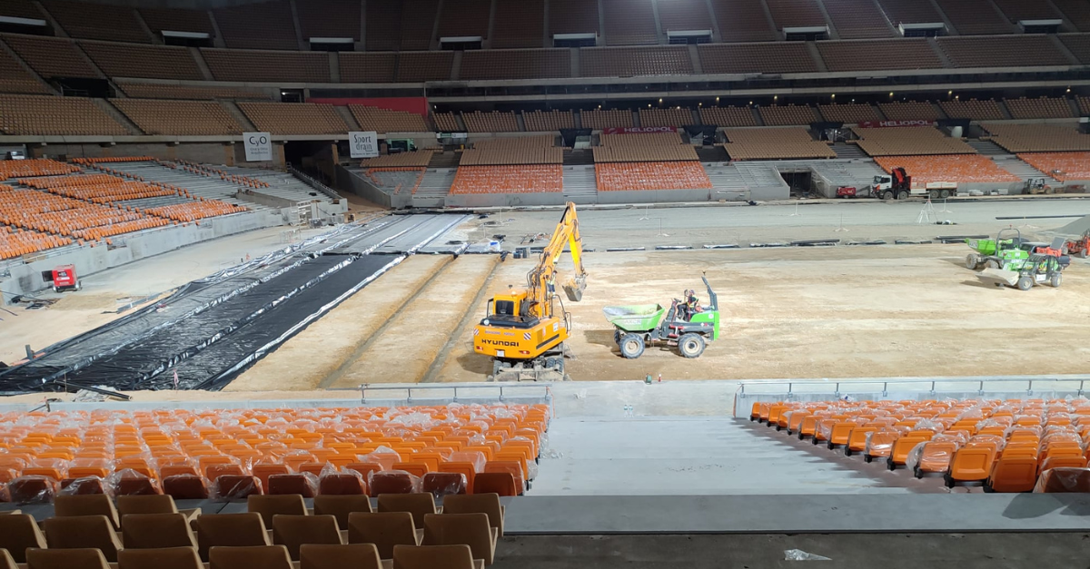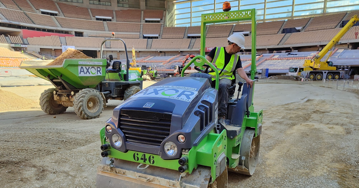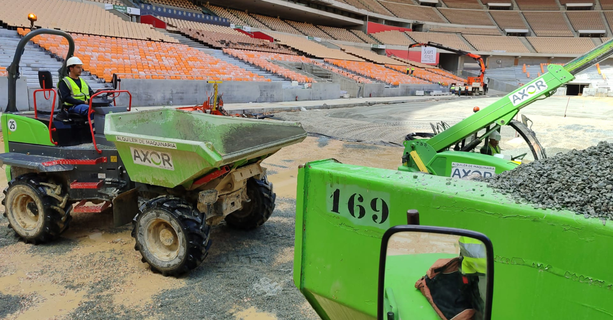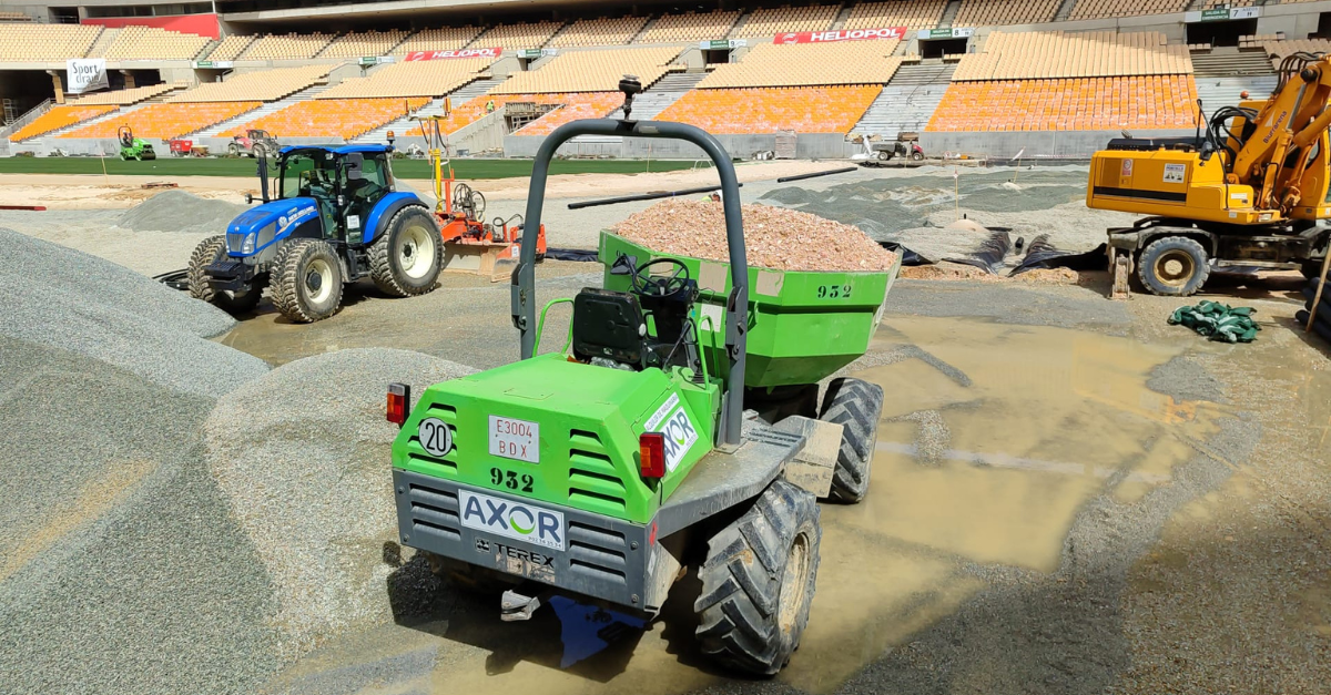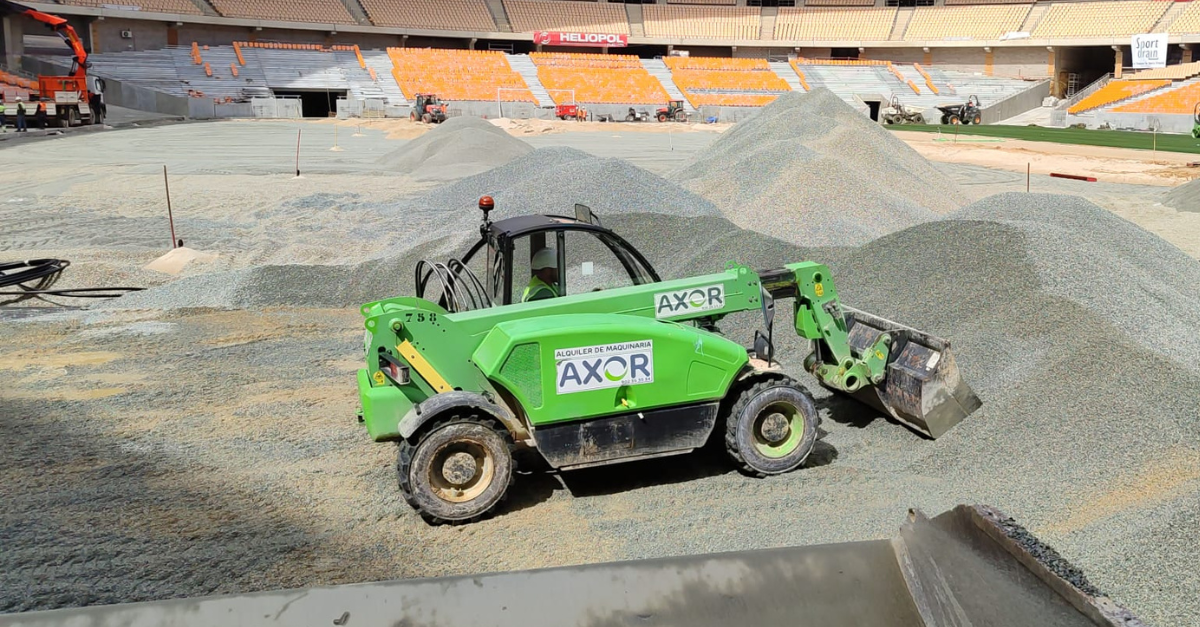 Manipuladores telescópicos, dumpers y rodillos se están encargando de que la nivelación y drenaje del terreno de juego sean óptimos. También se está trabajando ya en la implantación del césped del terreno de juego para la final.